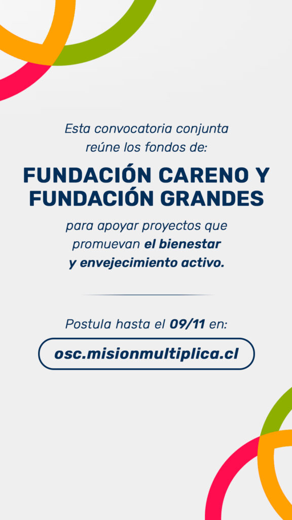 Invitamos a las organizaciones que trabajan con y para las personas mayores, de todo Chile, a postular a nuestro Fondo concursable. Se trata de una convocatoria que hacemos en conjunto con la Fundación Careno bajo el nombre «Convocatoria Mayores 2025 Misión Multiplica» . “Uno de nuestros pilares fundacionales es hacer sinergia con otras organizaciones que trabajan con un mismo propósito. Con este espíritu nace el Fondo Grandes, con el que financiamos proyectos dirigidos a personas mayores que tengan una mirada positiva de la vejez, en que se fomente la autonomía, la integración social y la intergeneracionalidad”, comenta Consuelo Moreno, directora ejecutiva de Grandes.